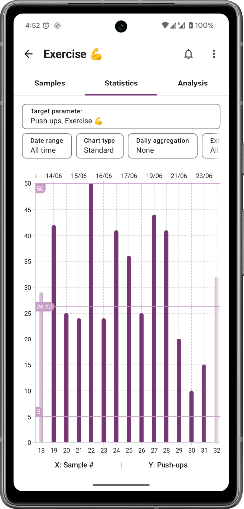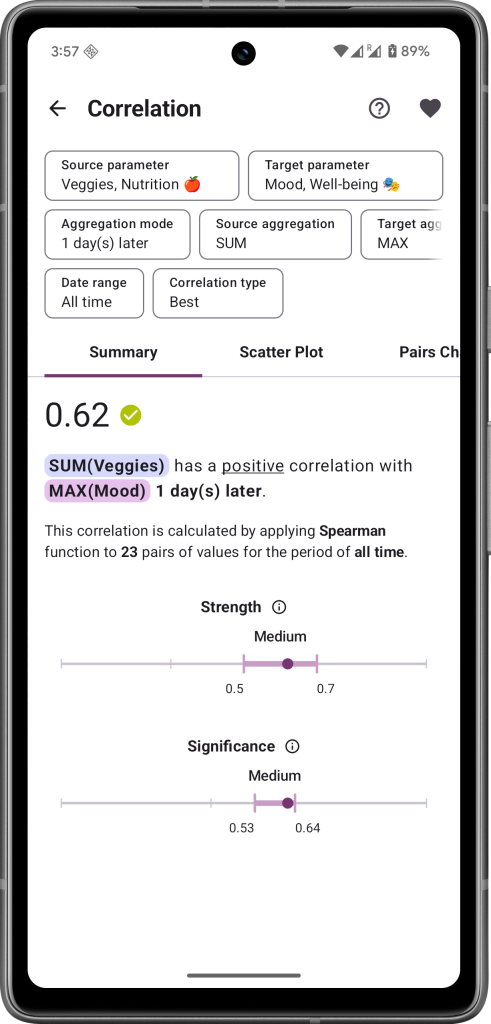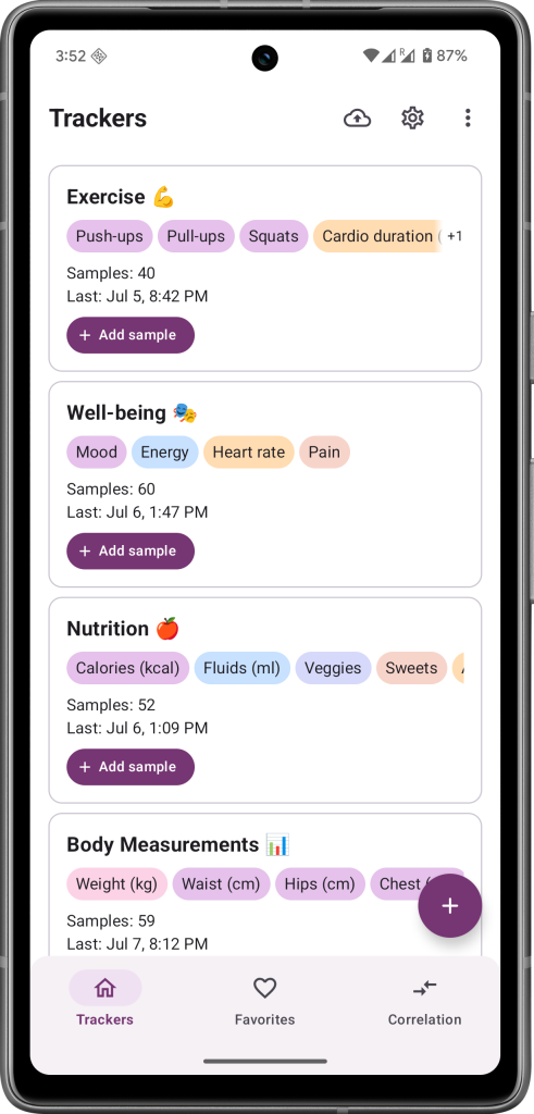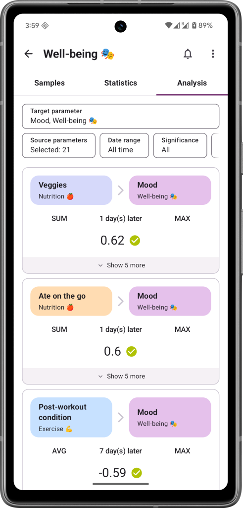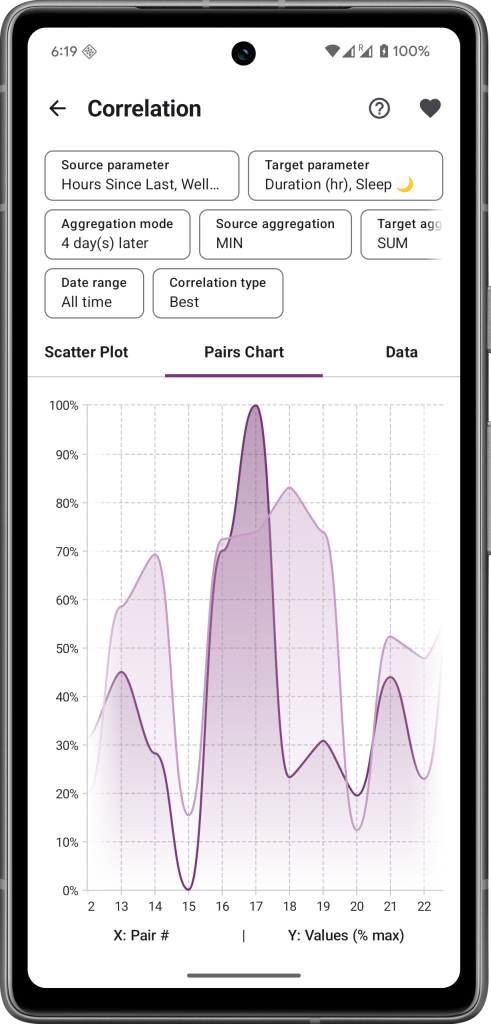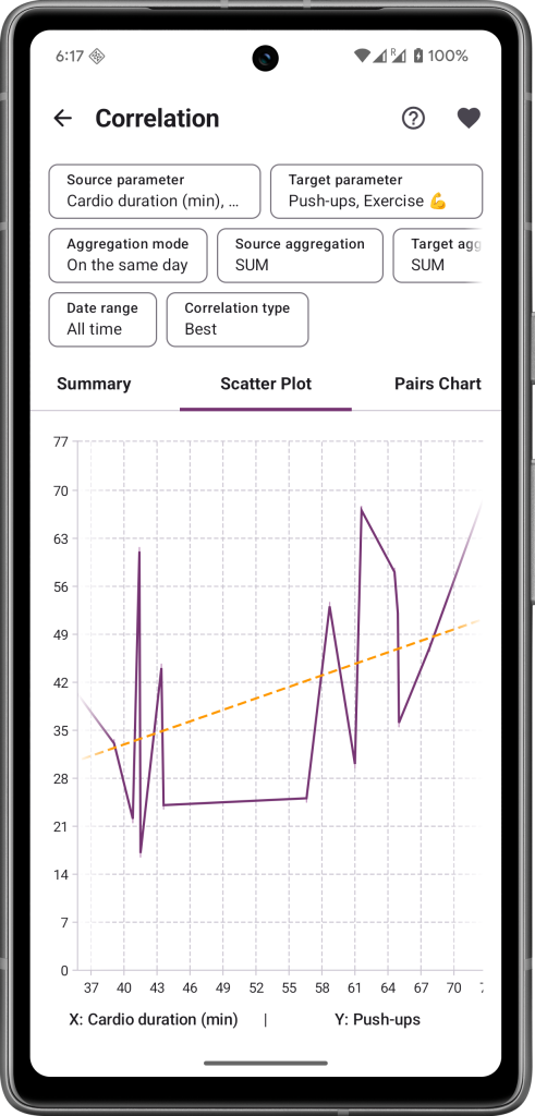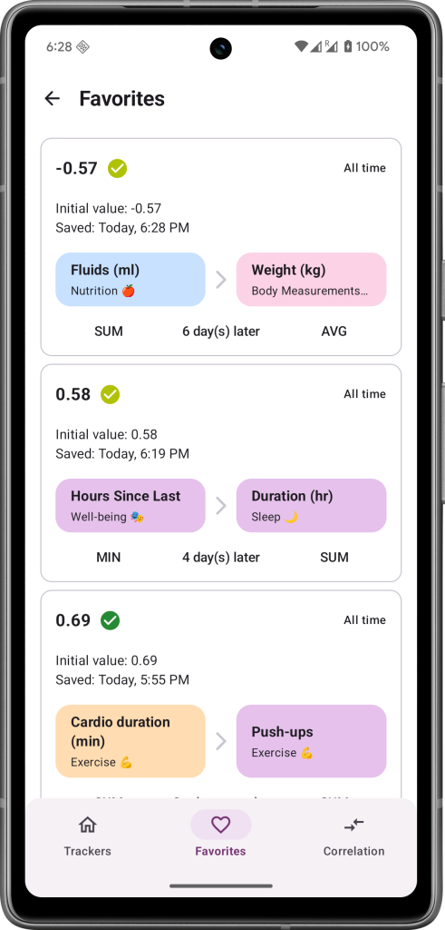 Our app doesn’t rely on vague AI predictions or hidden algorithms. Instead, it uses time-tested statistical methods to reveal actual correlations between the factors you track. Find out if a better night’s sleep really means a better workout, or if those extra steps are linked to a more positive mood. With Tracker, every insight is real, calculated, and backed by transparent math.
