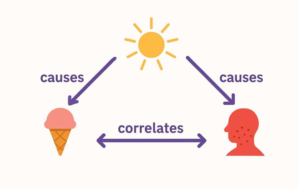 Research might show that on days when more ice cream is sold, more people also get sunburned. Does this mean ice cream causes sunburn? Of course not. The real cause is the hot weather, which leads to more sun exposure and more ice cream consumption.